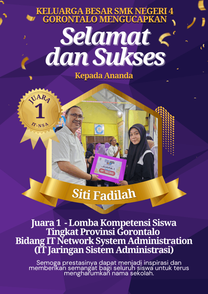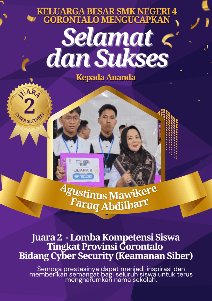Prestasi ini menjadi bukti nyata bahwa siswa SMK Negeri 4 Gorontalo selalu konsisten menunjukkan kompetensi, semangat belajar, dan dedikasi tinggi di bidang Teknologi Informasi dan Komunikasi. Kemenangan ini tidak hanya membanggakan sekolah, tetapi juga membuktikan bahwa siswa SMK mampu bersaing dan unggul dalam kompetisi tingkat tinggi.